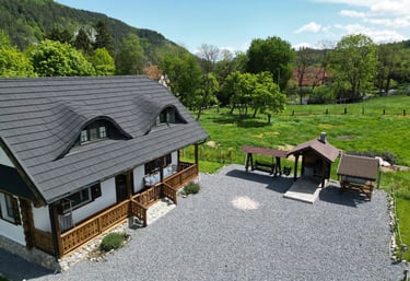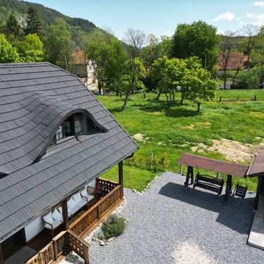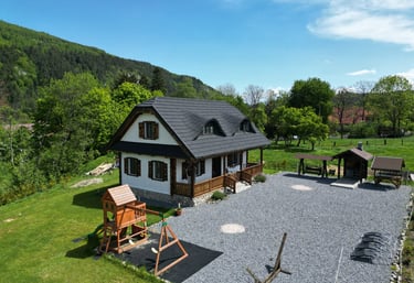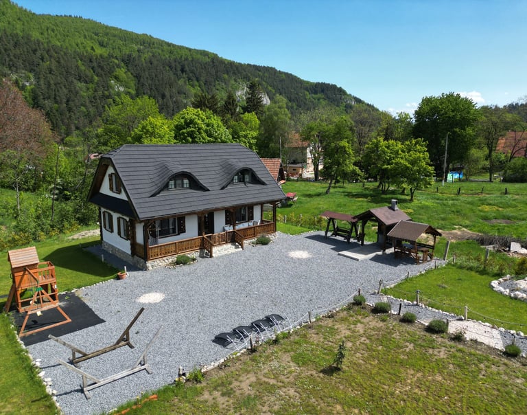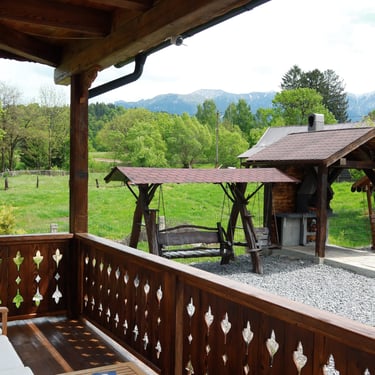 Mobilier exterior, grătar, balansoar și terasă la soare.
