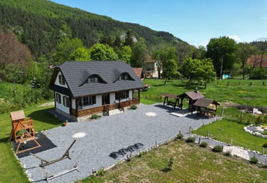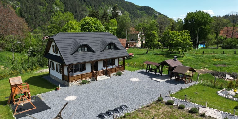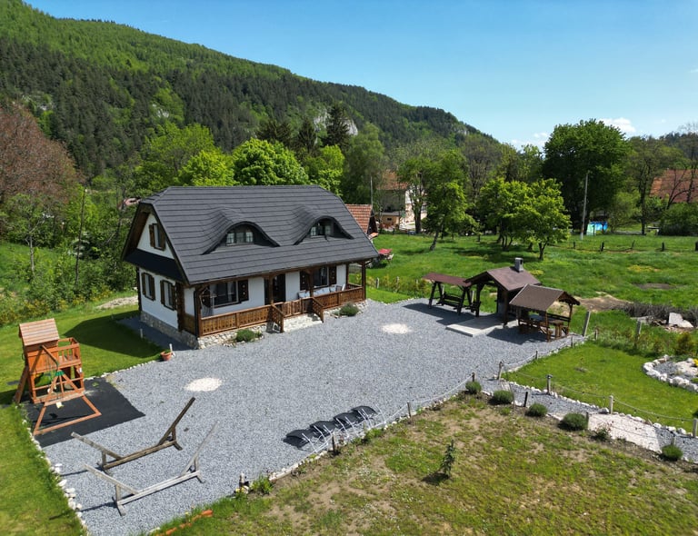 Ever since we arrived at the location and parked we were pleasantly impressed by what we saw. A very large courtyard with various facilities and a house like a fairytale surrounded by beautiful scenery. The house is clean, spacious and very nicely decorated in a rustic style. The hosts were very hospitable even welcoming us with fruit, cakes and a bottle of wine. Although we came prepared with different card games, we found here others, including backgammon and a game of remi which we enjoyed. It is a quiet and very nice place and we had a great time in the few days we had. I highly recommend!